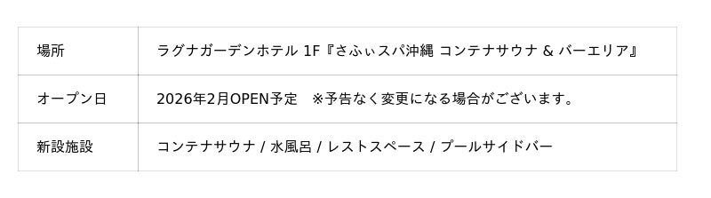 人気の既存施設「ラグナアクアゾーン」の男女浴場サウナを“琉球”をコンセプトに全面リニューアル。さらに、屋外プールエリアに沖縄リゾートのスパ体験を刷新するアウトドアサウナとプールサイドバーを新設します