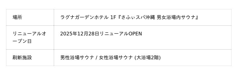 ラグナガーデンホテル(総支配人・新垣秀樹)では、屋内外プールと男女浴場、サウナが一体となった人気施設「ラグナアクアゾーン」の男女浴場併設インドアサウナを、サウナ界のレジェンド”ととのえ親方”こと松尾大氏プロデュースで2025年12月末に全面リニューアル。さらに2026年2月には屋外プールエリアにコンテナ型アウトドアサウナとプールサイドバーを新設し、ラグナアクアゾーンを「さふぃスパ沖縄」としてリブランドいたします。