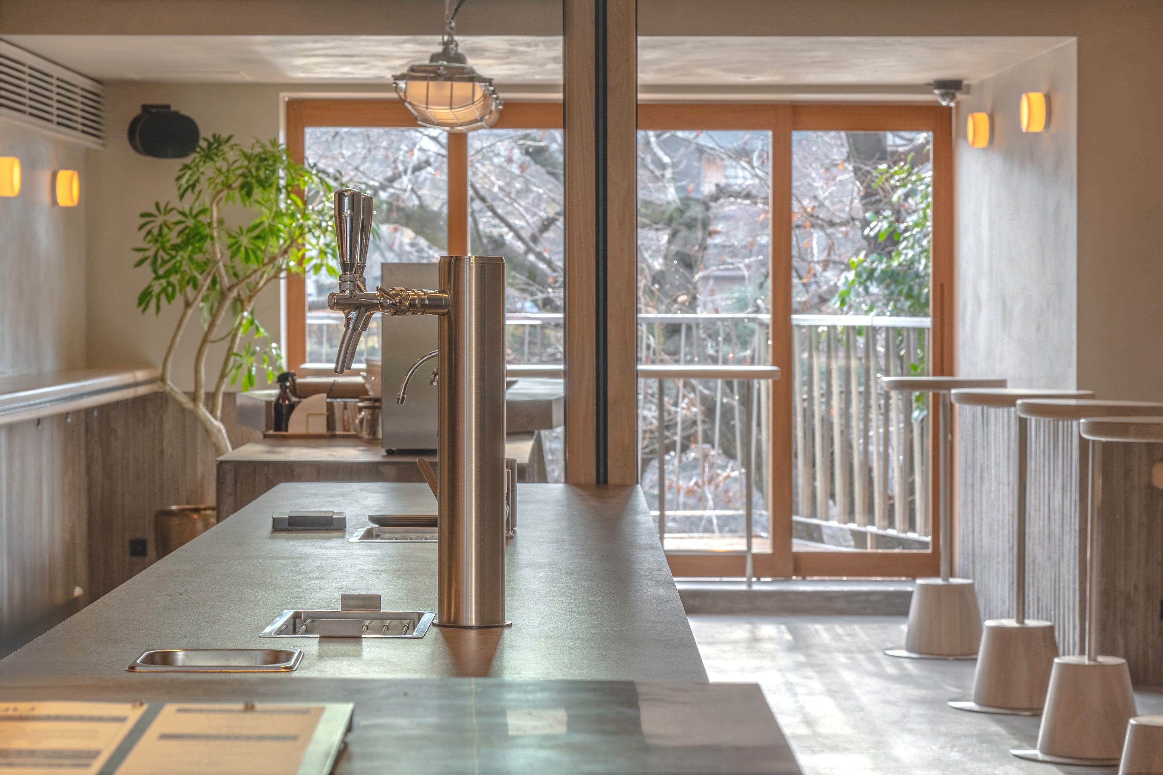 京町家の趣を残しながら、“伝統とモダンの間にある心地よさ”を追求した、開放感のある空間。鴨川を望むテラス席からは、季節ごとに表情を変える風景が広がります。1階はスタンディングカウンターを中心としたレイアウト。バリスタの抽出プロセスを忠実に再現できるハンドドリップマシンをカウンターに設置したことで、コーヒーを淹れている時間にも自然とバリスタとコミュニケーションが生まれ、その豆のストーリーに深く触れるなど、コーヒー体験がより多角的に広がる空間に仕上げています。夜は落ち着いた照明のもと、カクテルやクラフトビールなど思い思いの一杯をゆっくりとお楽しみいただけます。