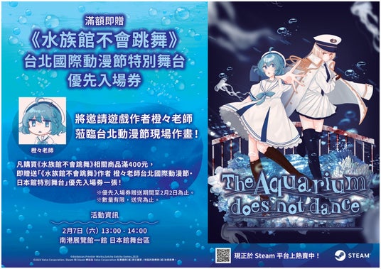 さらに、2月7日(土)13:00より、日本館ステージにて『アクアリウムは踊らない』作者・橙々さんのライブドローイングを開催します!また、2026年1月9日(金)~2月2日(月)にアニメイト台北店で『アクアリウムは踊らない』関連グッズをNT$400以上購入した方に本イベントの優先入場券を配布予定です。
