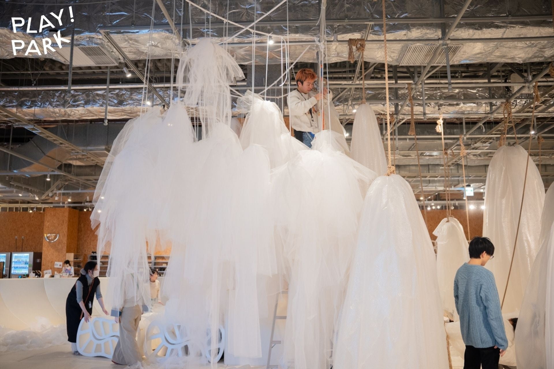 PLAY! PARKの遊具に決まった遊び方はありません。「チュール雲」を通して、自分なりの遊び方を見つけてみてください。