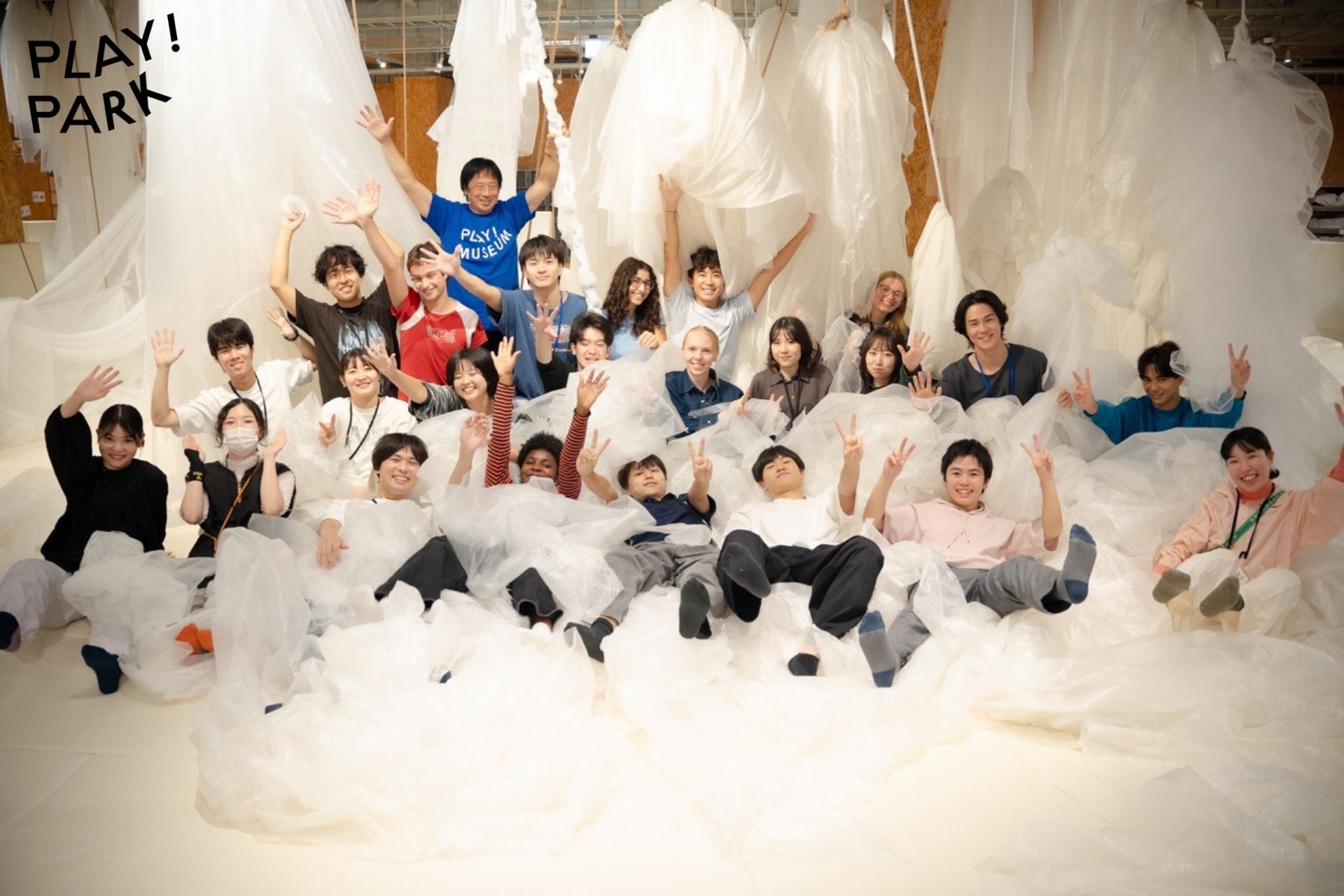 PLAY! PARKは、子どもたちが自由な発想で遊べる新しい屋内広場です。約1,000平方メートル の空間の中心には、〈大きなお皿〉と呼ばれる楕円型フィールドがあり、約半年周期で建築家やクリエイター、美術や建築を学ぶ学生たちと共同で、オリジナルの遊具を開発・制作しています。これまでは、平テープや新聞紙、プチプチ(R)、風船など身近な素材を使った大きな遊具を展開してきました。