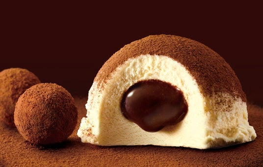 トリュフチョコソースの入ったアイスを丸く充填し、ココアパウダーをアイスの天面全体にトッピング。カップを開けた際、まるで本物のトリュフチョコがカップに入っているような見た目も楽しめます。ココアパウダーのほろ苦さが、バニラアイスとトリュフチョコソースの甘さを引き締め、味わいのアクセントとなっています。