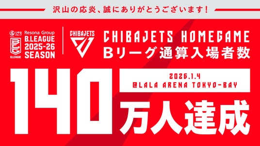 千葉ジェッツでは2026年1月4日(日)vs.富山グラウジーズ戦にて、B1リーグ戦(レギュラーシーズンのみの計算で公式記録として)通算入場者数140万人を突破したことをお知らせいたします。こちらはBリーグ最速での記録達成となります。
