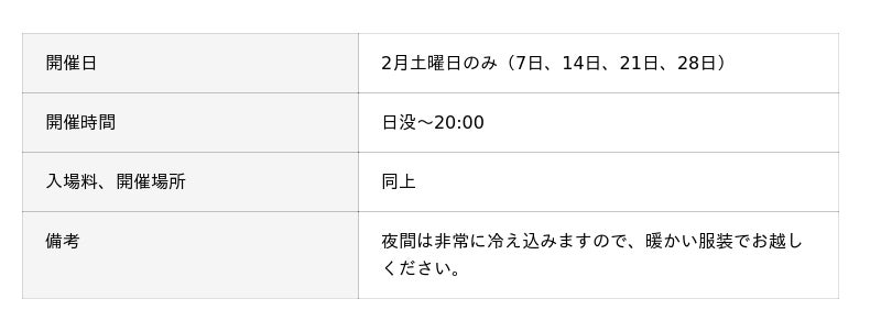 2月の土曜日限定で開催されるライトアップでは、巨大な氷柱が蒼や緑のLEDライトによって照らし出され、闇夜に浮かび上がる姿はまさに幻想的。まるで別世界に迷い込んだかのような、神秘的な空間を創り出します。