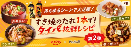 Nadia株式会社(東京都港区/代表取締役社長 葛城 嘉紀 以下「Nadia」)とエバラ食品工業株式会社(神奈川県横浜市/代表取締役社長 森村 剛士 以下「エバラ食品」)がタイアップし、「すき焼のたれ」の消費拡大を目的に、特別企画ページ【すき焼のたれ1本で!タイパ抜群レシピ第2弾】を公開いたします。