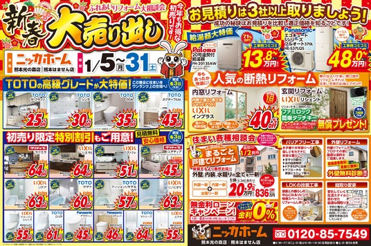 全国100店舗以上展開!2026年に創業39周年を迎える、リフォーム&増改築 ニッカホーム株式会社 (本社:愛知県名古屋市緑区篭山、代表取締役社長:西田裕久、以下 ニッカホーム)の熊本エリア・ニッカホーム熊本光の森ショールーム・ニッカホーム熊本はませんショールーム にて、26年1月5日より「新春初売りキャンペーン」を同時開催します!