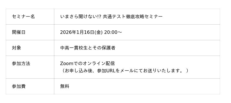 【2026年度入試対応】難化する『共通テスト』を最短ルートで攻略せよ。指導歴13年のエキスパートが教える中高一貫校生のための合格戦略セミナー開催