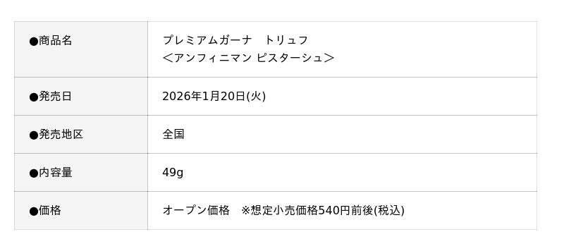 華やかに香るピスタチオチョコ、とろけるくちどけの濃厚なガーナホワイト、コクのあるピスタチオチョコ、こだわりの3層仕立てにより、ガーナホワイトと「アンフィニマン ピスターシュ」の調和をお楽しみいただける贅沢なトリュフです。