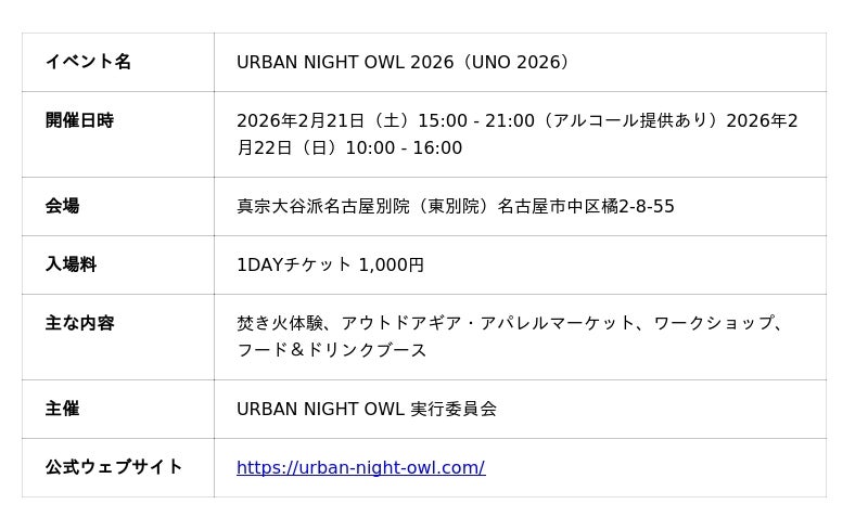 URBAN NIGHT OWL 実行委員会(代表:尾関良祐)は、2026年2月21日(土)・22日(日)の2日間、真宗大谷派名古屋別院(東別院)にて、都市型アウトドアイベント「URBAN NIGHT OWL 2026(以下、UNO)」を開催いたします。