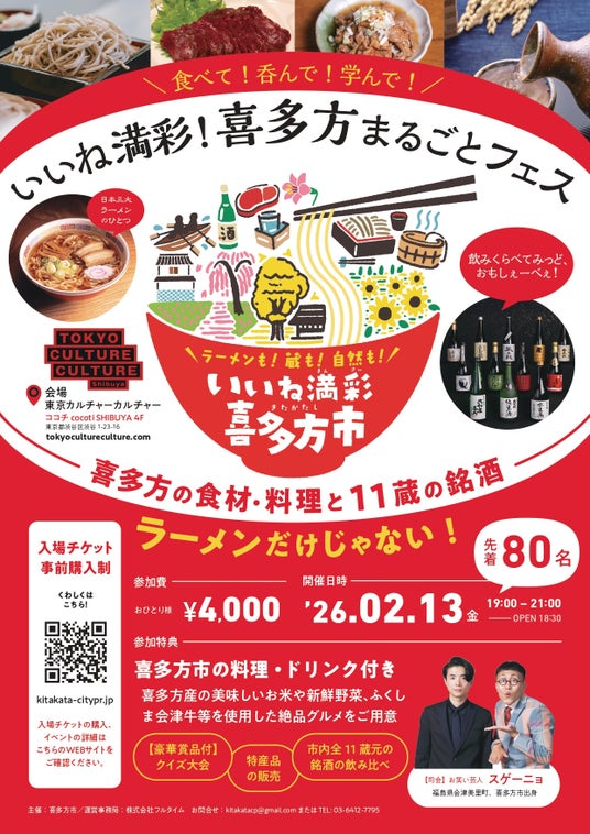 福島県喜多方市は市の魅力を発信する「いいね満彩!喜多方まるごとフェス」の3回目を、東京カルチャーカルチャー(東京都渋谷区)にて2月13日(金)に開催します。