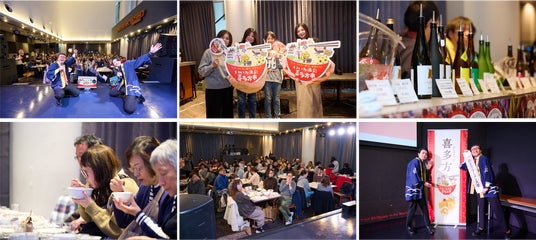 イベントでは、喜多方の旬の食材を使った料理や、喜多方ラーメンに山都そば、塩川鳥モツといった地元の特産品を堪能できるビュッフェ形式の食事を提供。喜多方の日本酒は20銘柄取り揃え、こちらも飲み放題!さらには喜多方の名産品が当たるクイズや抽選会も実施し、参加者の皆さんに楽しんでいただきました。