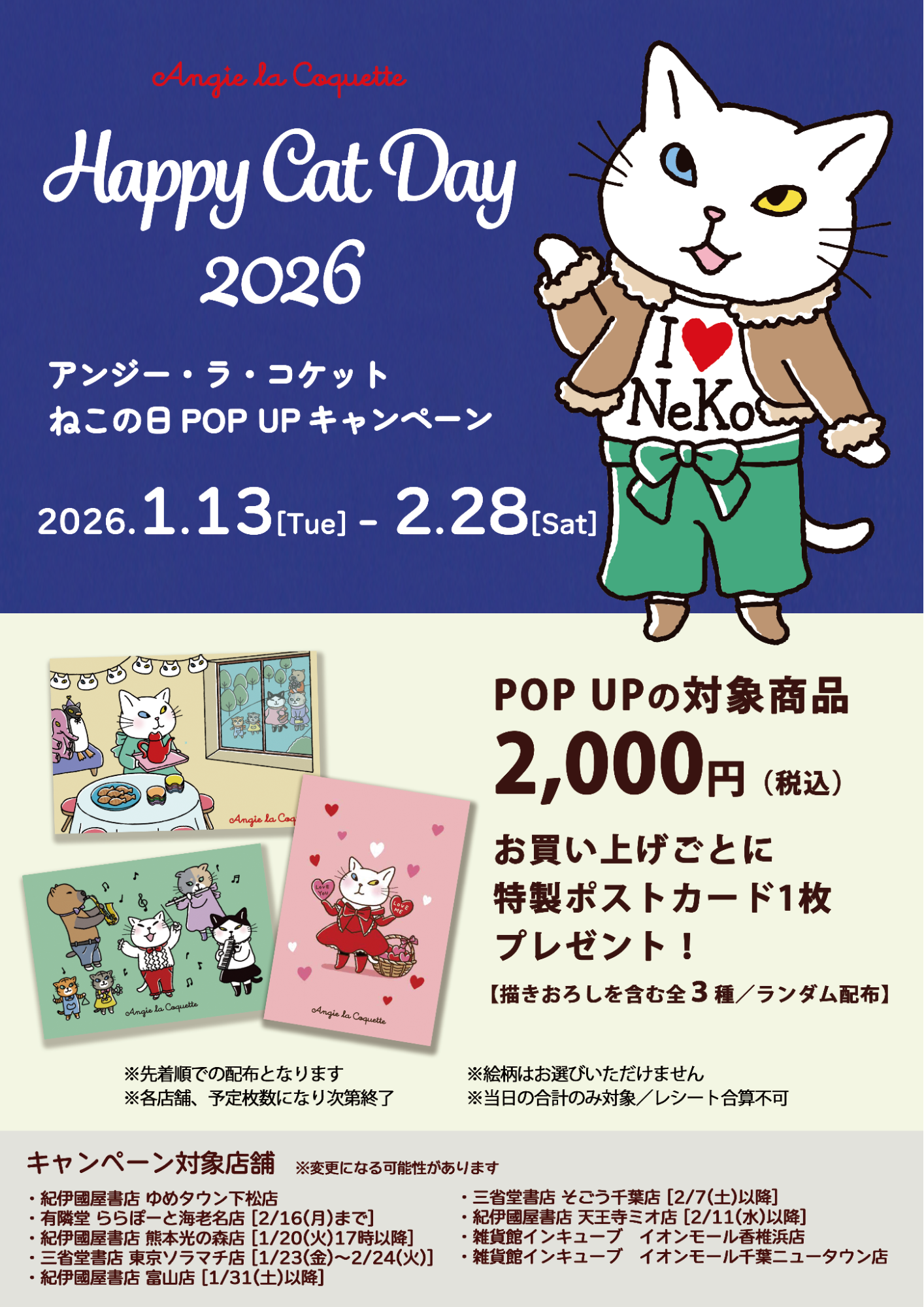 株式会社集英社DeNAプロジェクツ(本社:東京都渋谷区、代表取締役社長:渡辺圭吾)は、2026年1月13日(火)~2026年2月28日(土)の期間限定で、全国の書店などで展開中の「アンジー・ラ・コケット☆麗しのアンジー」ポップアップにて、期間限定で特製ポストカードをプレゼントする「ねこの日POP UPキャンペーン」を開催することをお知らせします。