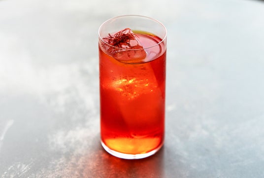 - (中央)イレヴンのクランベリーコーク風モクテルイレヴンのイメージカラーから着想を得た飲みやすいモクテルです。氷の上のサフランでイレヴンの印象的な長髪を表現しました。