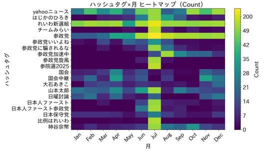 2025年のSNS上で政治系ハッシュタグの増減をヒートマップで可視化した図