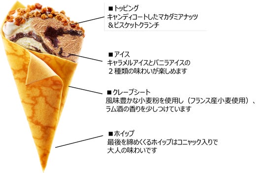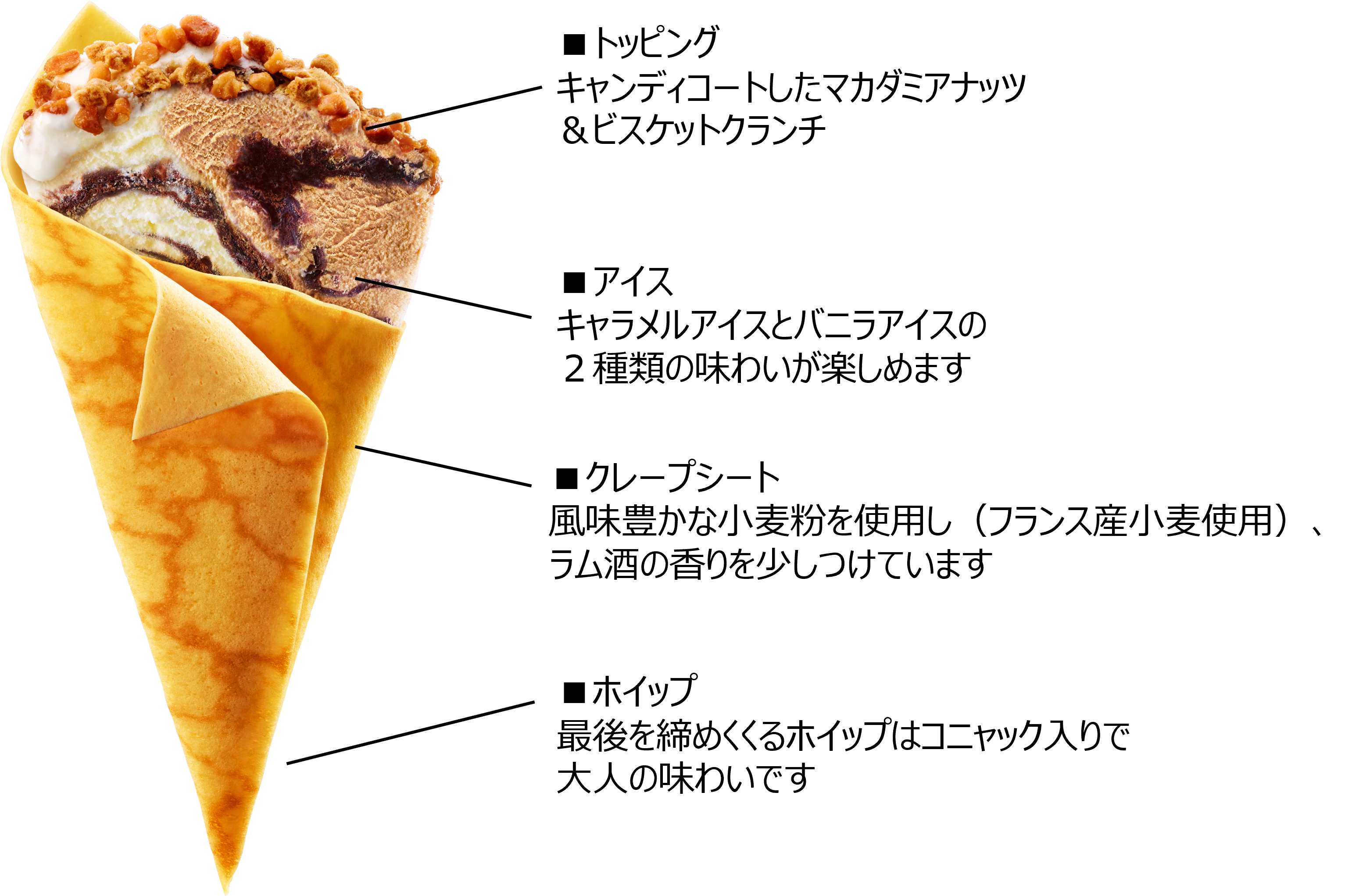 風味豊かな小麦粉を使用し(フランス産小麦使用)、ラム酒の香りをほんのりとまとわせたクレープシートで、キャラメルアイスとバニラアイス、そして2種類のアイスと相性の良い少しビターなチョコを包みました。キャンディコートしたマカダミアナッツとビスケットクランチをトッピングし、食感も楽しむことができます。締めくくりのホイップはコニャック入りで大人向けの味わいで、一口目から最後まで食感と味わいの変化を楽しめるご褒美クレープアイスです。デザインは、黒ベースで商品の魅力を際立たせ、「ザ・クレープ」というブランド名も英語ロゴで表現しました。リッチで特別感のある時間を演出します。