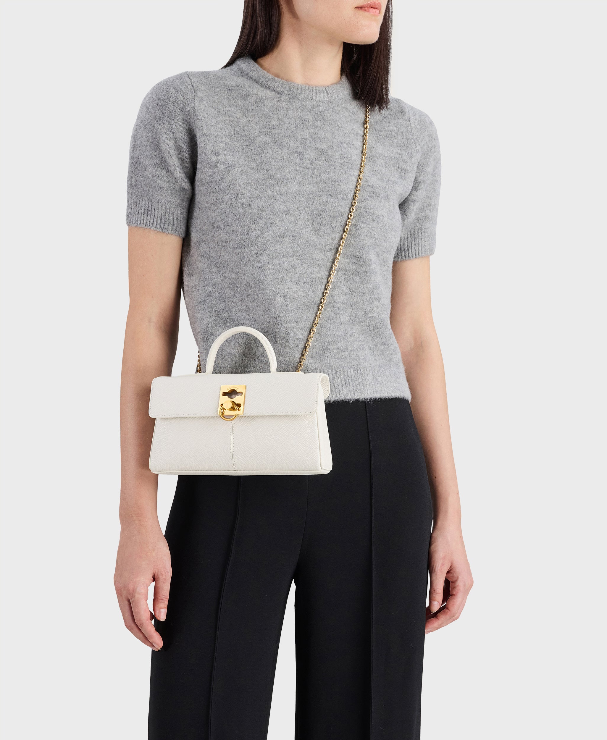 バックルディテール付きの、取り外し・長さ調整可能なショルダーストラップを備え、クロスボディ、ショルダー、クラッチと、シーンに合わせた持ち方が楽しめるのも特徴です。