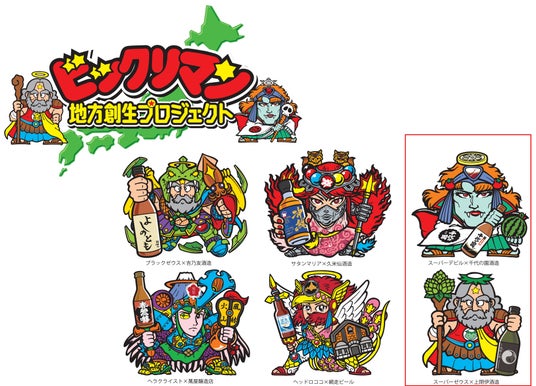 人気の”ヘッド”たちが、それぞれの酒類メーカーの商品、地元色を彩った、描き下ろし(かきおろし)の装いで登場します。もちろん、1本(1セット)に、限定BIGビックリマンシール1枚付きとなります。
