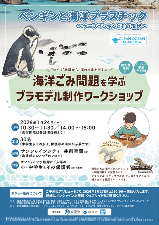 サンシャイン水族館(東京・池袋)は、静岡市、株式会社BANDAI SPIRITSと共催で、海洋プラスチック問題を親子で学ぶ体験イベントを1月24日(土)に開催します。