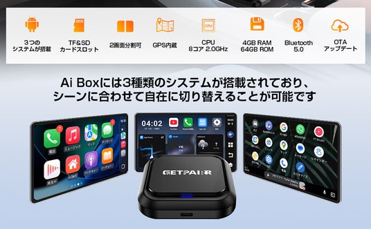 GetPairr AI Box 2.0は、CarPlay・Android Auto・Android 13の3システムに対応。