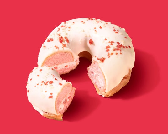 【内容】ピンク色のドーナツ生地にいちご果肉入りミルクホイップをサンドし、上からホワイトチョココーティングと2種類のクランチをトッピングしました。
