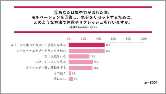 本調査で、集中力が切れた際の休憩・リフレッシュ方法を調査したところ、「コーヒー・エナジードリンクを飲む」と同じ割合で「スイーツを食べる」(48.1%)が1位を獲得しました。