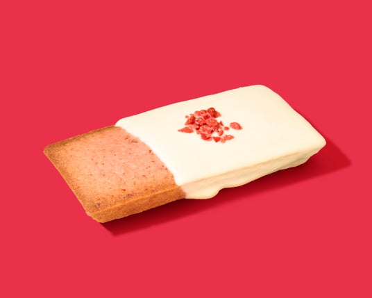 【内容】いちごピューレやいちごパウダーを加えたいちご味のバウムクーヘンにホワイトチョコをかけ、いちごフレークをトッピングしました。