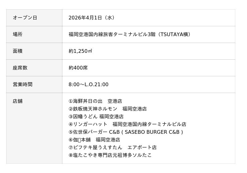 - 新「the foodtimes」には福岡空港初となる7店舗を含む福岡・九州発祥の人気店計8店舗がオープンします。海鮮やうどん、焼きカレーなどのほか、クイック需要に対応するバーガーや軽食など幅広いジャンルが揃います。座席は約400席で、小上がり席で滑走路を見ながら食事ができるファミリーエリアや、充電設備のあるビジネスエリアなどを設け、航空旅客だけでなく空港見学や送迎など空港へお越しになる方々が様々なシーンでご利用いただけます。