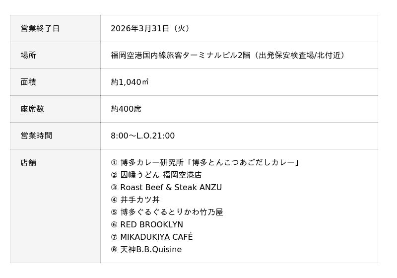 - なお、国内線2階にある現在の「the foodtimes」は2026年3月31日(火)に営業を終了します。
