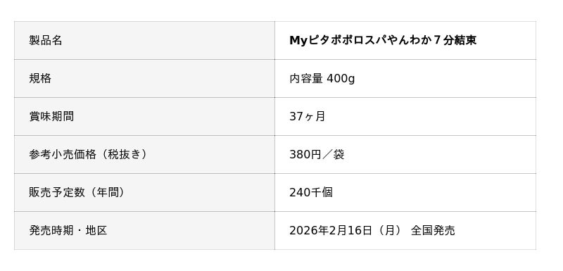 今回は、デュラム小麦のセモリナと中力粉を配合し、やわらかい食感に仕上げた「Myピタポポロスパやんわか7分結束」を発売します。ゆで時間は当社の「ポポロスパ」(デュラム小麦のセモリナ100%の通常のパスタ)と同じ7分で、ちょっと少なめに1人前80gに結束しています。