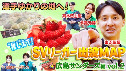 新しい未来のテレビ「ABEMA(アベマ)」は、2026年1月10日に『SVリーガー出没MAP~広島サンダーズ・金子聖輝選手~』を配信いたしました。お笑いコンビ・翠星チークダンスがMCを務め、広島サンダーズに所属する永露元稀選手、金子聖輝選手、高木啓士郎選手が出演しました。