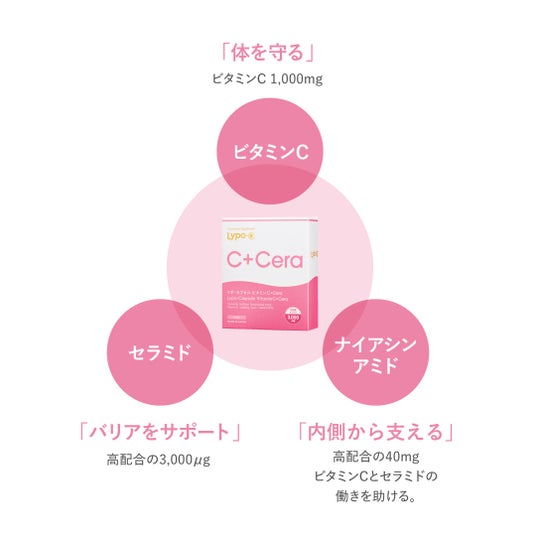C+Ceraでは、Lypo-Cがこれまで培ってきたリポ・カプセルテクノロジーを採用しています。水溶性の成分と脂溶性の成分を一つのカプセルに包み込むことで、日常の中でも取り入れやすい形を目指しました。