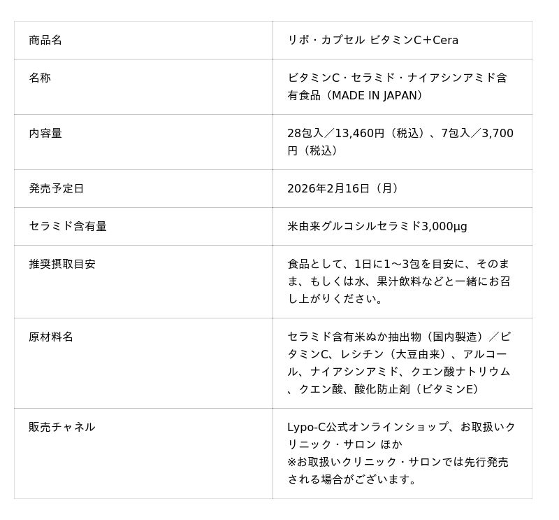 「未来の健康を、つくる。」を掲げる株式会社スピック(本社:神奈川県鎌倉市、代表取締役社長:芝田崇行)は、インナーケアブランド「Lypo-C」から、セラミド×ビタミンC×ナイアシンアミドを1包で摂取できる新製品「Lypo-C Vitamin C+Cera(リポ・カプセル ビタミン シー プラス セラ)」を2026年2月16日(月)に発売いたします。