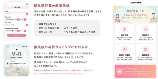 ルナルナアプリ内では、緊急避妊薬の服薬記録を行う機能や、服薬日から3週間後にアプリから体調確認のタイミングをお知らせする機能を提供予定です。また、避妊に関する正しい知識について、産婦人科医監修の情報ポータル「避妊情報ナビ」を公開し、プライバシーに配慮した設計のもとで、利用者に寄り添った情報提供が行われます。なお、ルナルナに関するお問い合わせは、公式ブランドサイトをご確認ください。