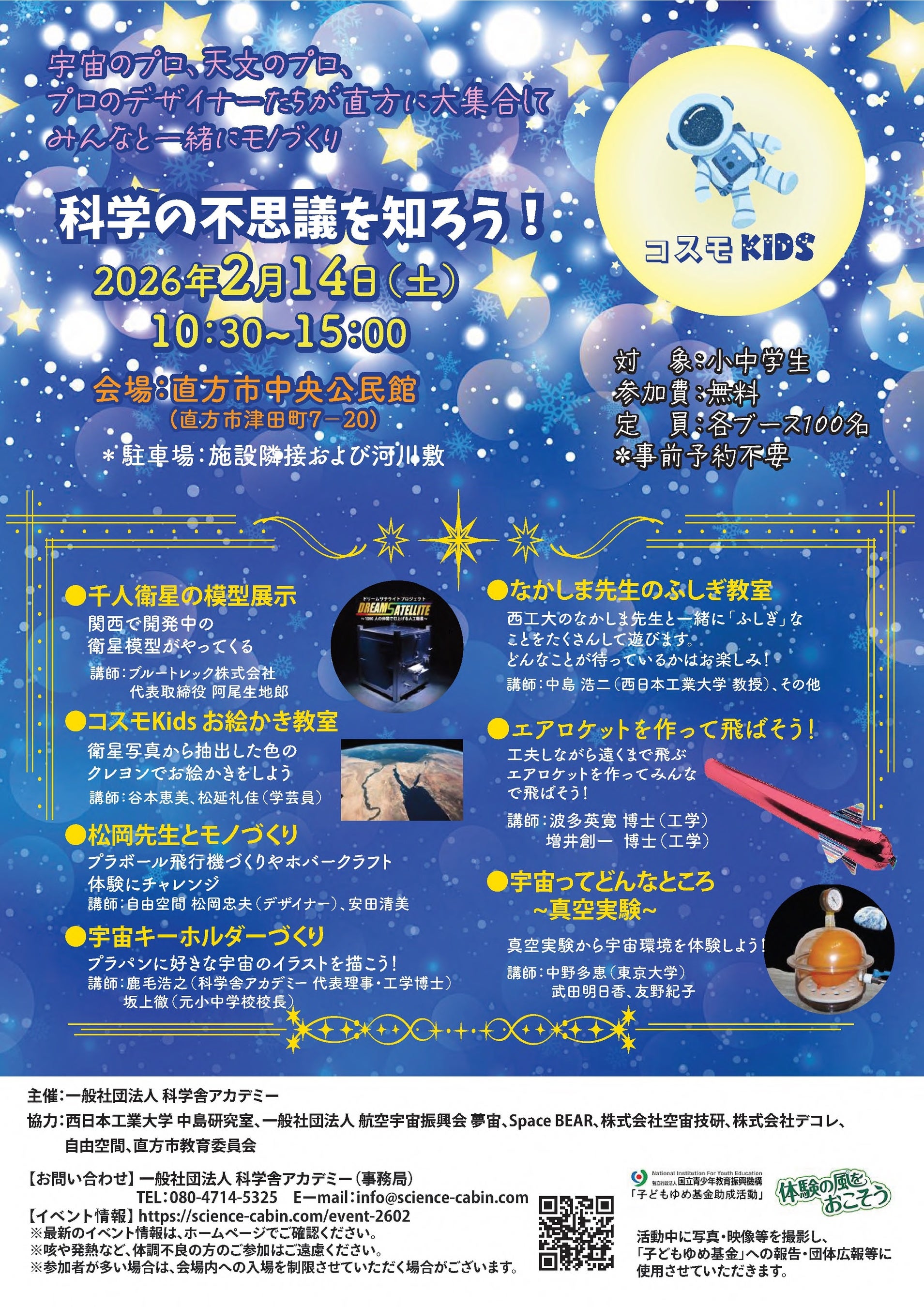今回、宇宙のプロ、天文のプロ、そしてプロのデザイナーたちが直方に集結し、こどもたちと一緒に“見て・触れて・作る”モノづくりや実験を通じて、宇宙の不思議を楽しく体験します。
