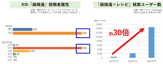 味わいの検討においては、直近アジアンフードに関心を持つ若年女性が多いことに着目。特に「麻辣湯(マーラータン)」は、若年女性を中心に高い人気を獲得しており、麻辣湯専門店の増加と連動し、検索エンジンにおける2025年度の「麻辣湯×レシピ」検索ユーザー数は2023年度と比較して約30倍に急増しています。こうした背景から、今後も注目されることが予想される「麻辣湯」を筆頭にした3種のアジアンスープをラインアップに迎えました。