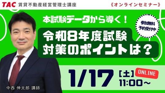 TAC株式会社(東京都千代田区、代表取締役社長:多田 敏男)は、賃貸不動産経営管理士試験合格を目指す方を対象とした無料オンラインセミナーを2026年1月17日(土)に開催いたします。