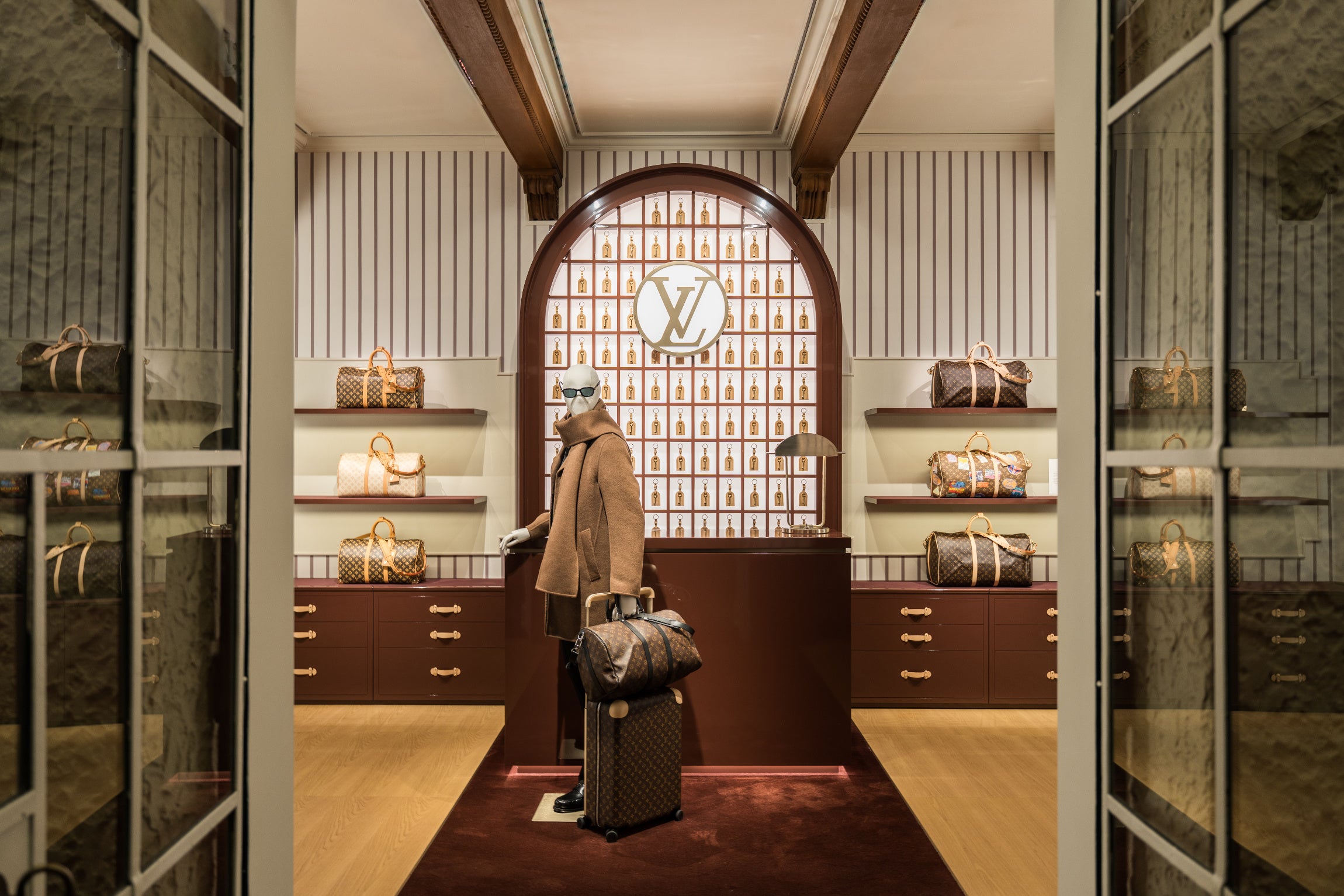 1月1日より、世界中のルイ・ヴィトンのウィンドウでは、誕生以来受け継がれてきたモノグラムの真髄がディスプレイされています。真の価値を追求するメゾンの姿勢を表現し、すべてのルイ・ヴィトンのバッグが長年愛用いただけるよう作られていることを物語るこれらのディスプレイでは、誕生当時に商標登録されたモノグラムのデザインを忠実に再現。また、当時数十年間にわたって使用されていた、歴史的な木製のモノグラム・スタンプの複製も展示されています。まるでルイ・ヴィトンのホテルであるかのような遊び心に溢れた雰囲気の中、アニバーサリーのテーマを体現する「グルーム」たちは、この後に続くポップアップの体験を予感させ、1897年に特許を取得したモノグラム・キャンバスを封印した封蝋を想起させるモチーフが、ウィンドウ・ディスプレイをさらに華やかに彩ります。
