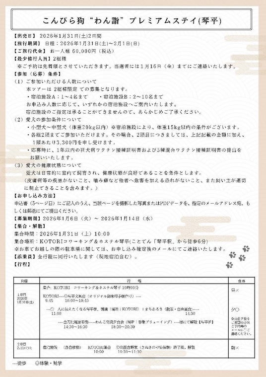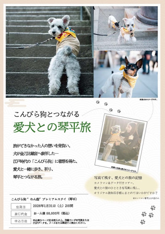 2026年1月30日(金)~2月1日(日)に開催される「2026年わん詣(わんもうで)~わんこの三が日~」を契機に、犬と一緒に“歩き、泊まり、体験できる”琴平の旅コンテンツが本格的にそろいました。本取り組みでは、お散歩マップによる町歩き、旅行会社による宿泊付きツアー、OTAを活用した体験プランを連動させ、犬連れ旅行者が実際に「予約できる」環境整備を進めています。