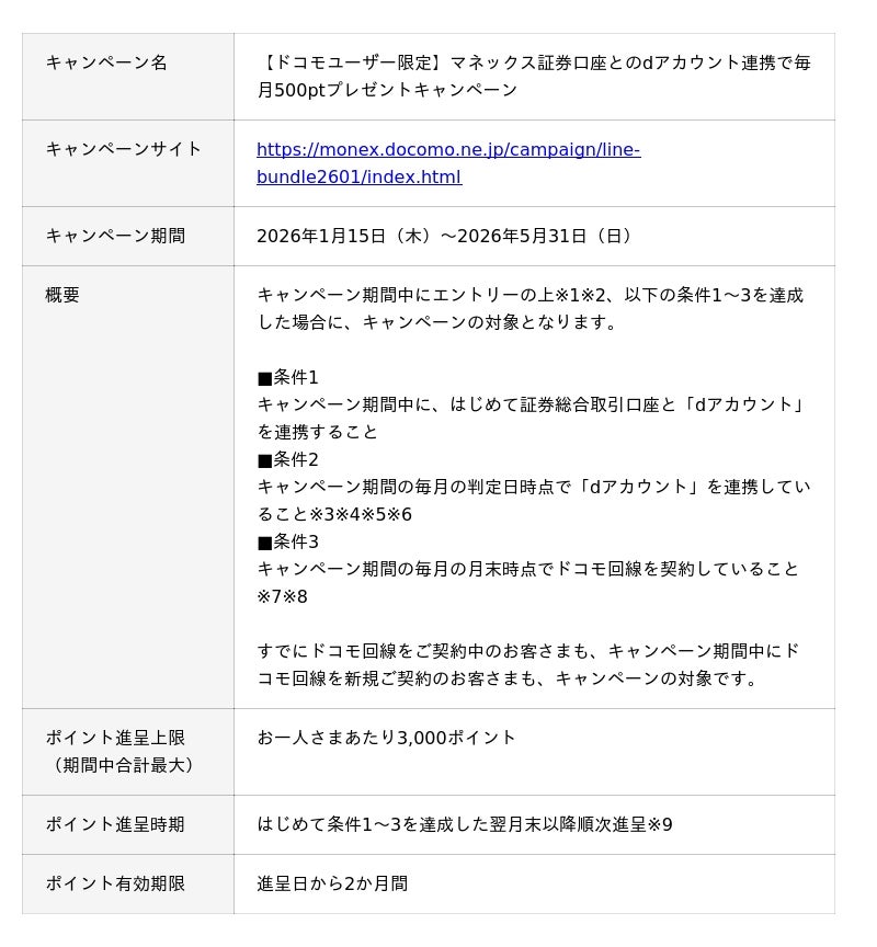 株式会社NTTドコモ(以下、ドコモ)は、ドコモ回線をご契約のお客さまを対象に、マネックス証券株式会社(以下、マネックス証券)の証券総合取引口座と「dアカウント(R)」をはじめて連携すると、最大6か月間、dポイント(期間・用途限定)をもれなく進呈する「【ドコモユーザー限定】マネックス証券口座とのdアカウント連携 で毎月500ptプレゼントキャンペーン」(以下、本キャンペーン)を、2026年1月15日(木)から2026年5月31日(日)まで開催します。