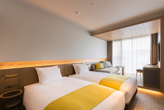 120cm幅のシングルサイズベッドを2台設置した室内。お部屋の奥には、ご自宅のようにおくつろぎいただけるソファスペースをご用意しました。また、身支度に便利な三面鏡付きのデスクも備えており、ゆったりとした滞在をお楽しみいただけます。
