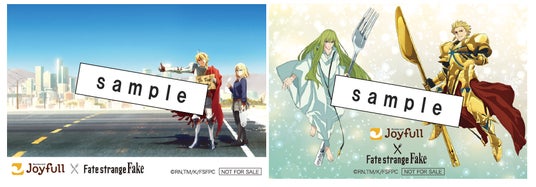 コラボ限定オリジナルポストカードは、「アヤカ・サジョウ」と「セイバー」のTVシリーズ ティザービジュアル[US ver.]をモチーフしたデザインと、「アーチャー」と「ランサー」がジョイフルロゴ入りフォークとナイフを手に持ったデザインです。