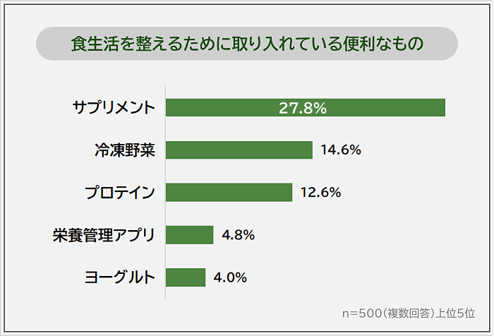 「食生活を整えるために取り入れている便利なもの」を聞いたところ、圧倒的な1位は「サプリメント(27.8%)」でした。2位「冷凍野菜(14.6%)」、3位「プロテイン(12.6%)」が続きます。