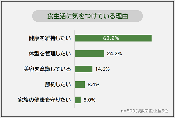 食生活に気をつけている理由の圧倒的な1位は「健康を維持したい(63.2%)」でした。2位「体型を管理したい(24.2%)」、3位「美容を意識している(14.6%)」が続きます。