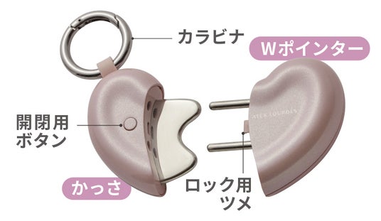 専用のプレートを肌に滑らせてアプローチする中国由来の美容メソッド「かっさ」と、丸い先端の棒で肌を押して顔まわりや筋膜をケアする「Wポインター」が1つのチャームアクセサリーになった新発想の美容ツール。(意匠登録出願中)