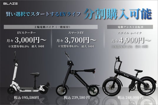 株式会社ブレイズ(愛知県名古屋市、代表取締役:市川秀幸、以下ブレイズ)は、主力3製品の電動アシスト自転車「スタイル e-バイク」、2輪電動バイク「スマートEV」・「EVスクーター」において、導入しやすい分割払いプランをご案内しています。