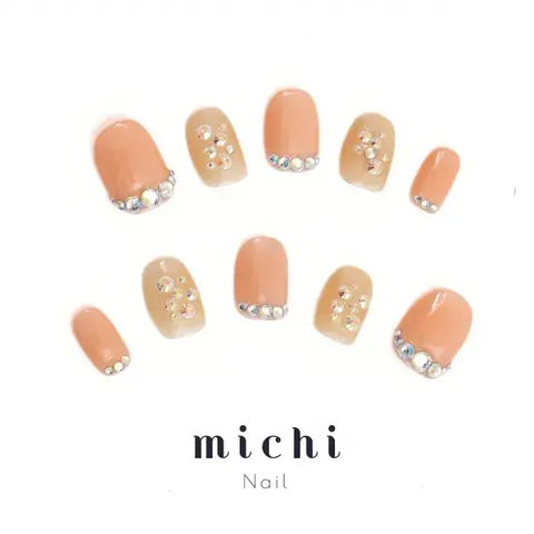 ストーンを散りばめた華やかなデザインで、パーティーやお出掛けにぴったり。ヌーディーカラーをベースにしているため、華やかさがありながら普段使いにも取り入れやすいネイルチップです。