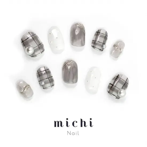 シアーブラックのニュアンスチェックが大人可愛いデザイン。さりげないシルバーミラーと大きめパールをアクセントに取り入れ、上品さと華やかさを両立しています。落ち着いた中にも存在感のあるネイルチップです。
