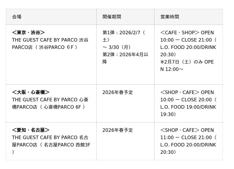 また、東京・渋谷PARCOのほか、大阪・心斎橋 PARCO、愛知・名古屋 PARCOでも2026年春より順次開催予定です。