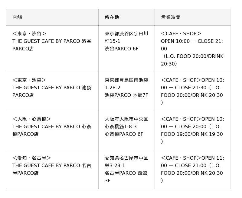 「THE GUEST CAFE BY PARCO」 は店舗総数4店舗(2026年1月現在)展開し、様々なコンテンツやブランドに対してのお客様が持つ愛を深耕し、より多くのお客様とのコンテンツ同士が魅力的な出会う場を、パルコがプロデュースしています。